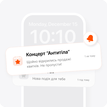 Отримуй сповіщення, як тільки подія з твоїм ключовим словом з’являється онлайн. Отримай можливість бути серед перших, хто придбає квитки.