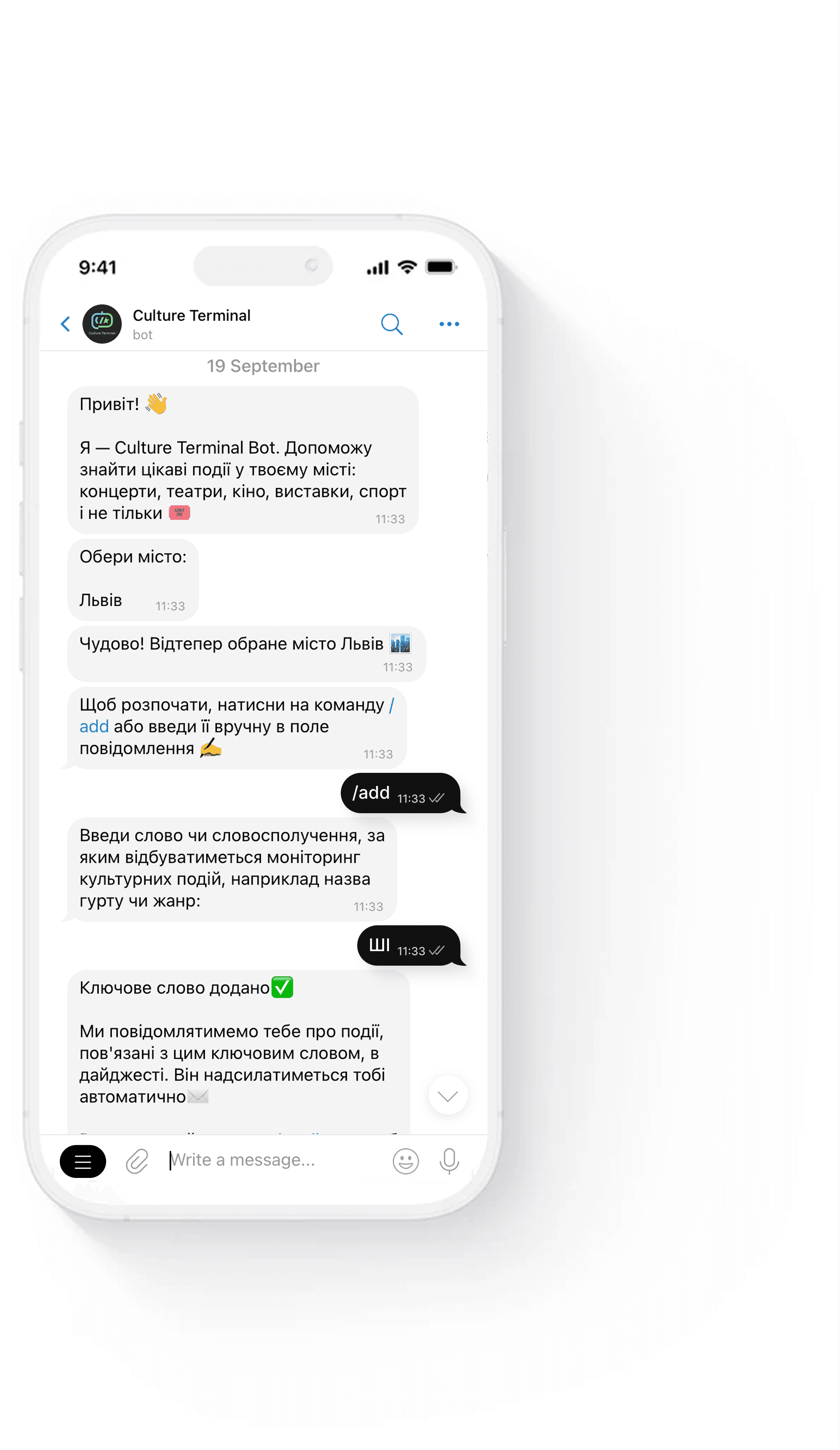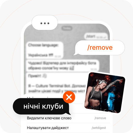 Додай фокусні ключові слова: імена артистів, культурні майданчики, теми виставок чи будь-які інші інтереси, які хочеш відстежувати з нашим ботом.