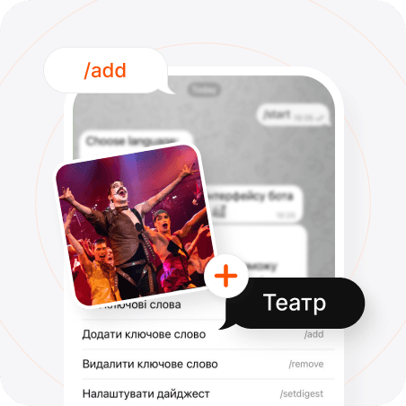 Налаштовуй, які події бот відстежує: додавай нові ключові слова або прибирай зайві — і отримуй сповіщення тільки про те, що тобі справді цікаво.